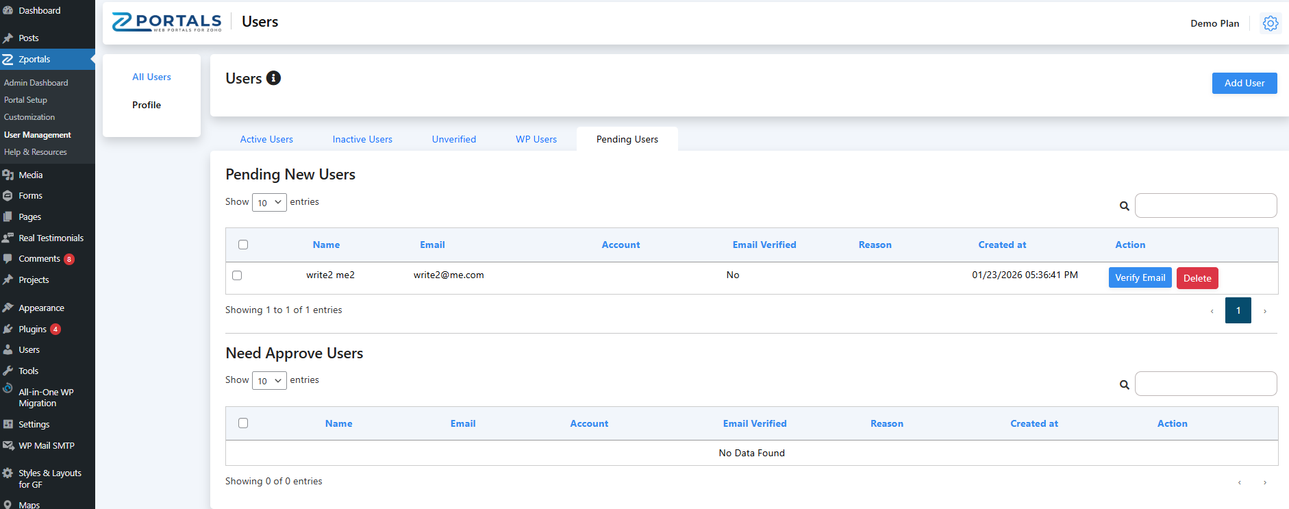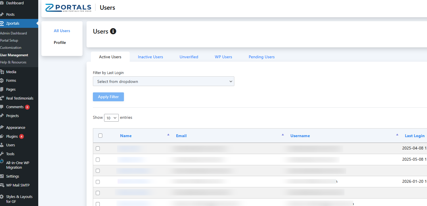 All ZPortals users are added to WordPress Client users and are visible in the WP Users tab as well as the main WordPress Users menu.