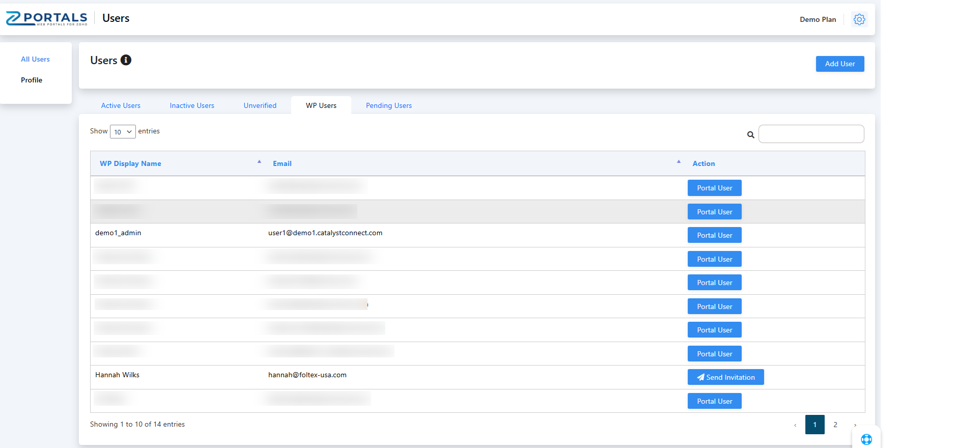 The WP Users tab will be a list of all WordPress users with a ZPortals portal status:
