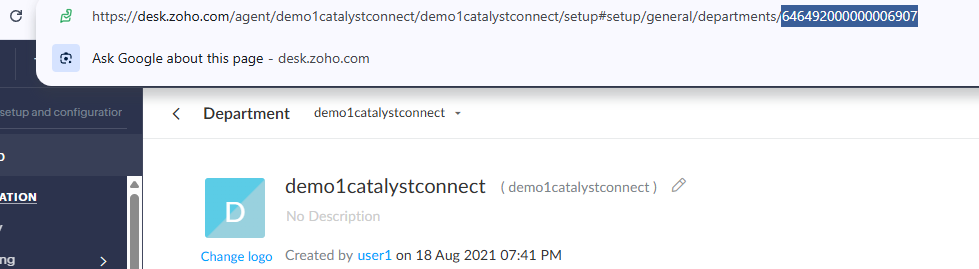 Obtain the Desk Department ID by navigating in Zoho Desk to Setup - Organization - Departments. Select the Department you would like to enable and copy the ID in the URL into the Department ID field in ZPortals. Copy the email address for the department and input it into the Support Email Address field: