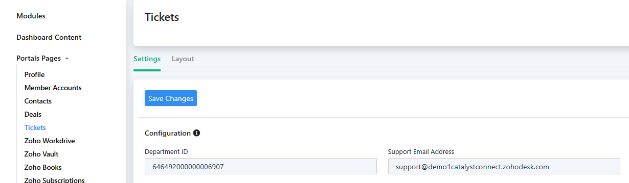 Zoho Desk tickets can be displayed in the portal as long as it is properly integrated with Zoho CRM. After connecting Zoho Desk in ZPortals - Portal Setup, navigate to Customization - Portal Pages - Tickets to enable the menu.