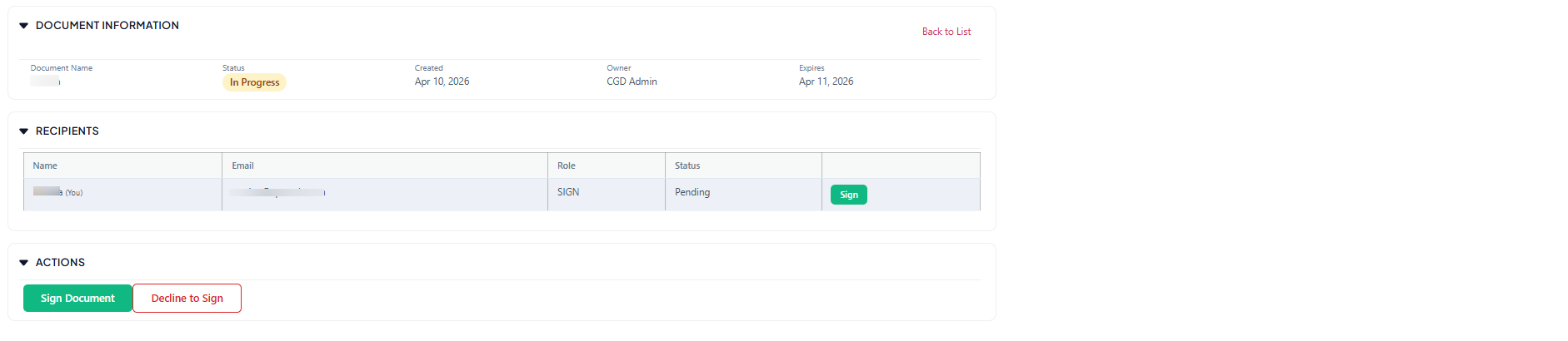 Click into the eyeball icon to see document details and the "Sign" button to begin signing or decline: