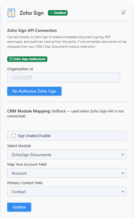 In ZPortals - Portal Setup - Zoho Sign, select the checkbox and map the module, account and contact fields: