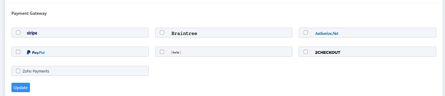 Finally, select the payment gateway you have integrated in Zoho Finance: