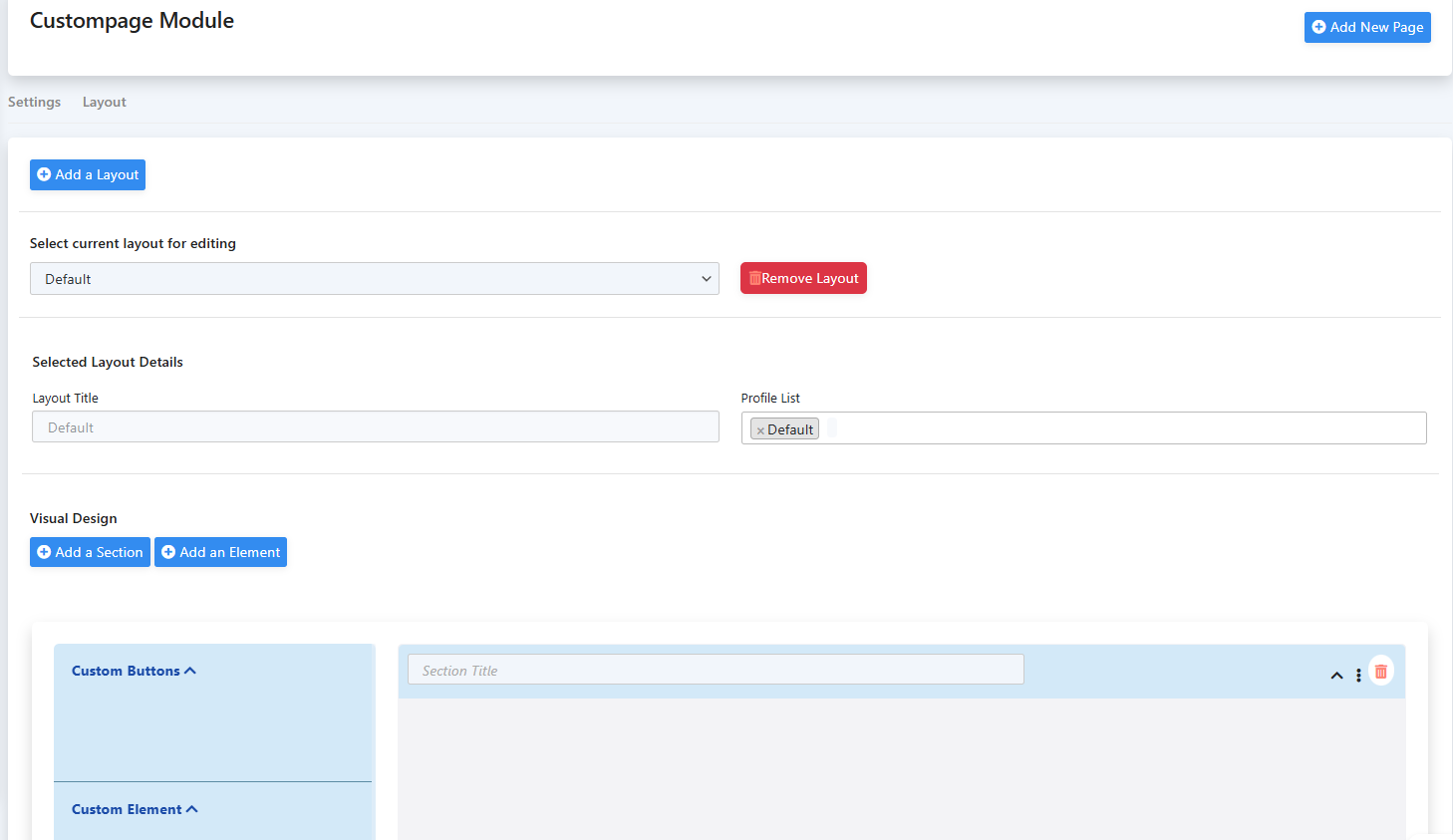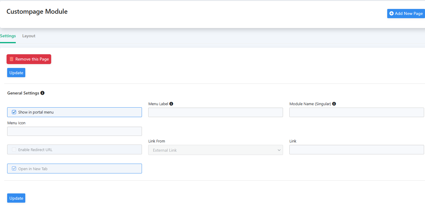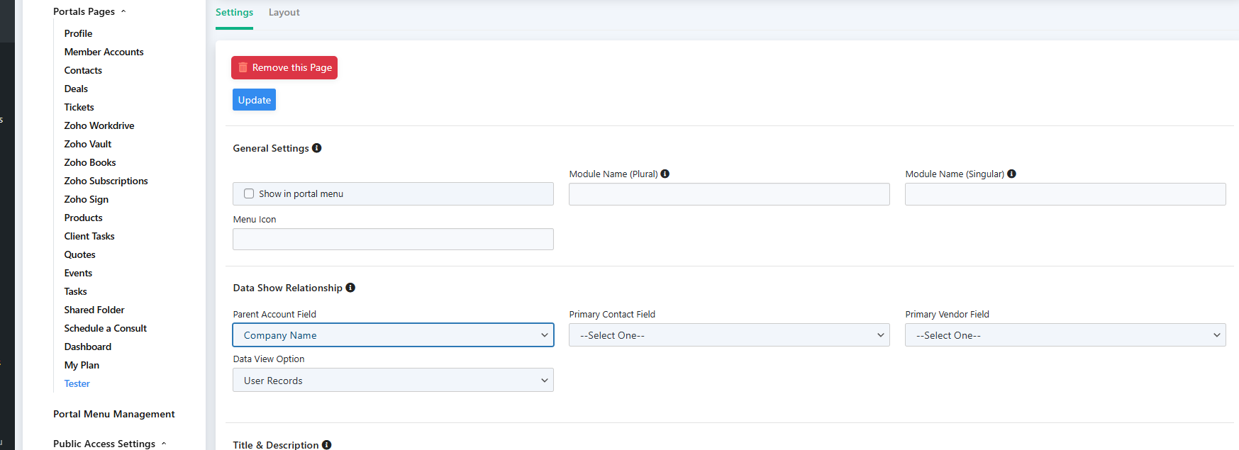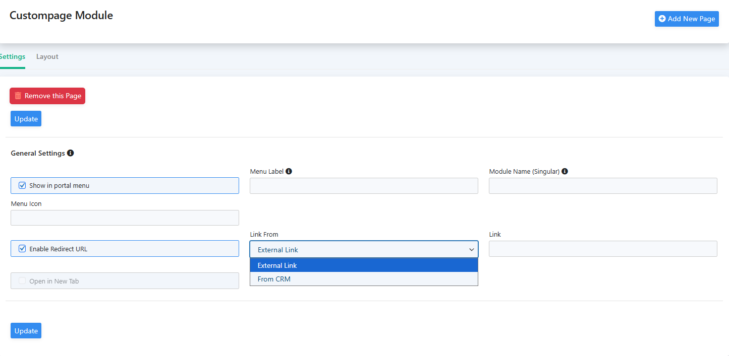 Once you select "Save" the Settings and Layout for the page can be modified. If you enabled this new page from a CRM module, the customization will be slightly different than a page of external content.