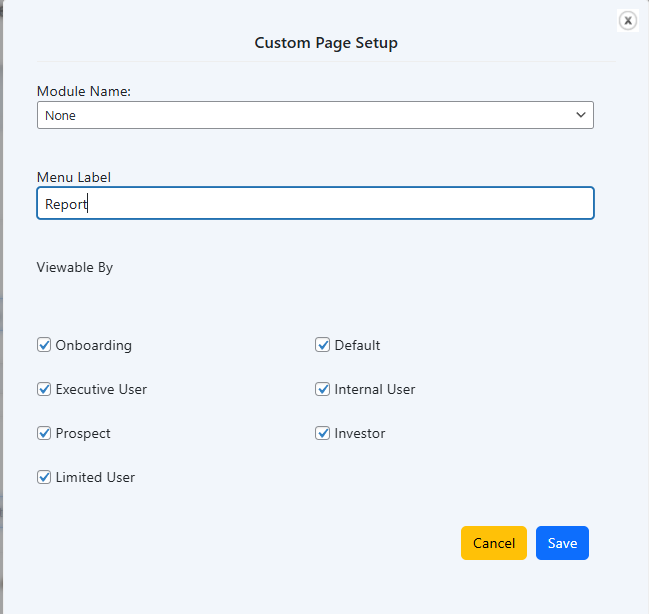 If the new menu will be a page with iFrames, banners and custom text, the Settings tab will be slightly different. When adding the new page, leave the first drop down to the value "None" and input a menu label: