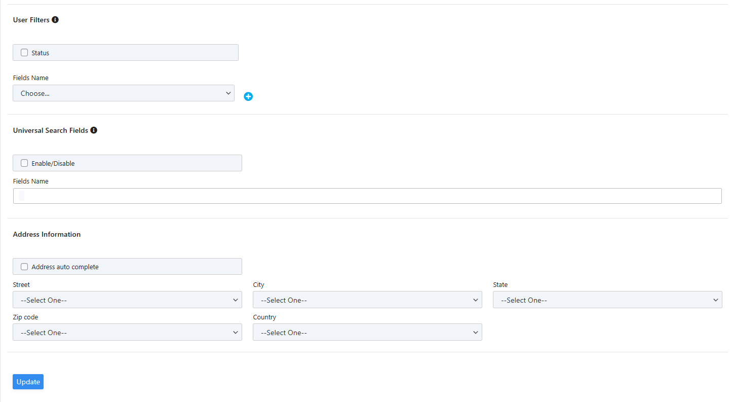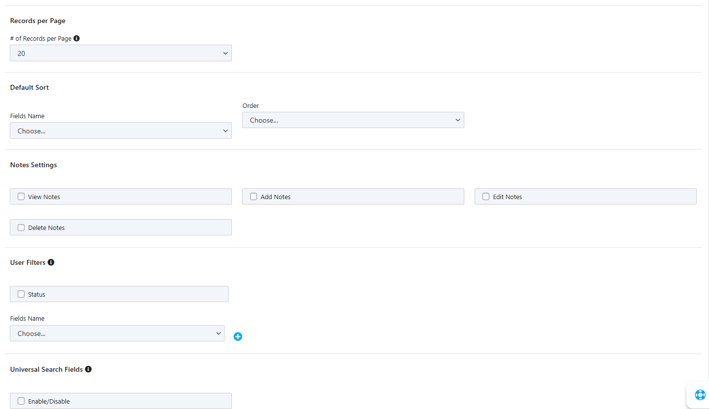 The admin can set a default number of records per page and use the "Default Sort" section to display records in a certain order, i.e. most recently created first. Decide whether to show / add / edit / delete the CRM record notes. If the module has many records, the admin can provide the portal user frontend filters by enabling the "User Filters" and/or the "Universal Search in CRM."
