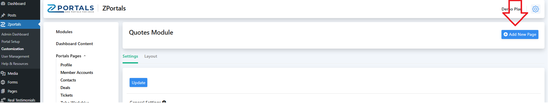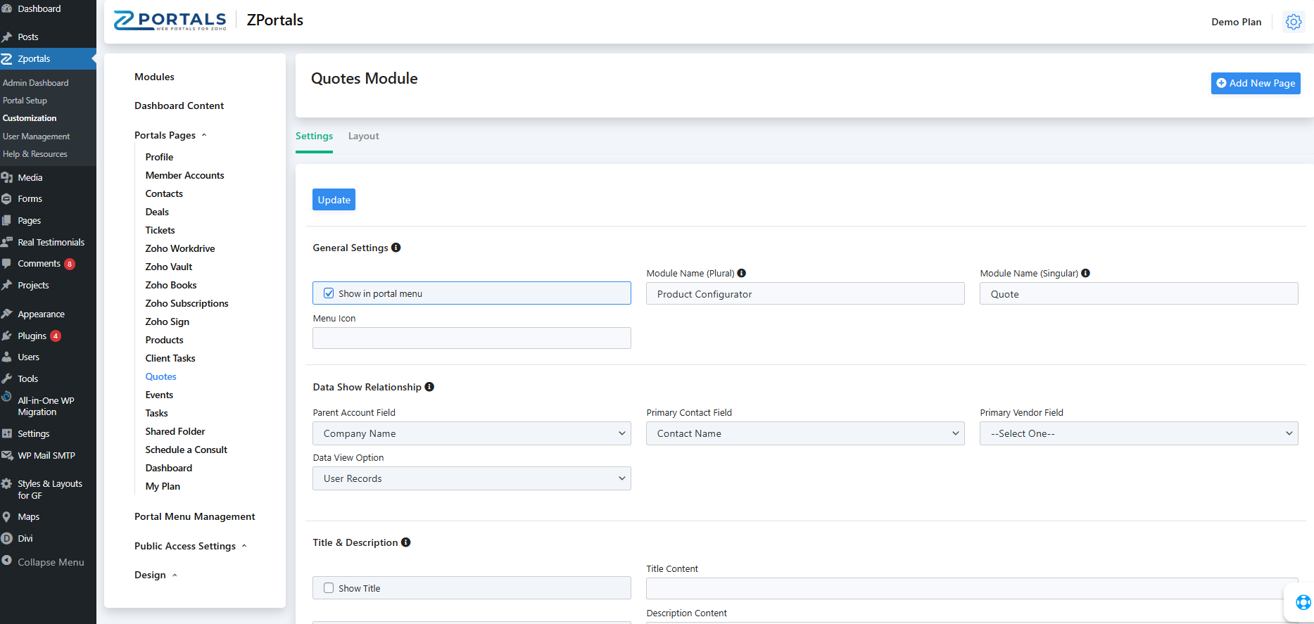 When Zoho apps are connected in ZPortals' Portal Setup, the admin can enable and configure them as menus.