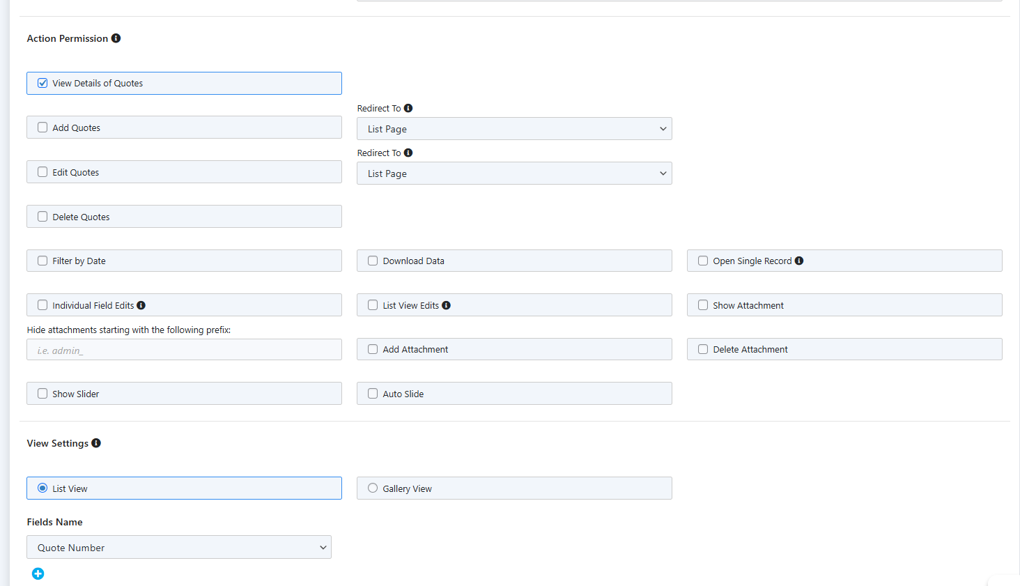 The settings will contain edit permissions in the "Action Permission" section with redirect preferences upon edit and adding a record. Other permissions to consider are whether you would like the user to be able to download a list of data or engage with CRM attachments. The "Open single record" option will directly open the layout of fields when there is only one record in the module to display. The "Individual Field Edits" will allow the portal user to edit a field at a time instead of opening up the whole layout for editing.