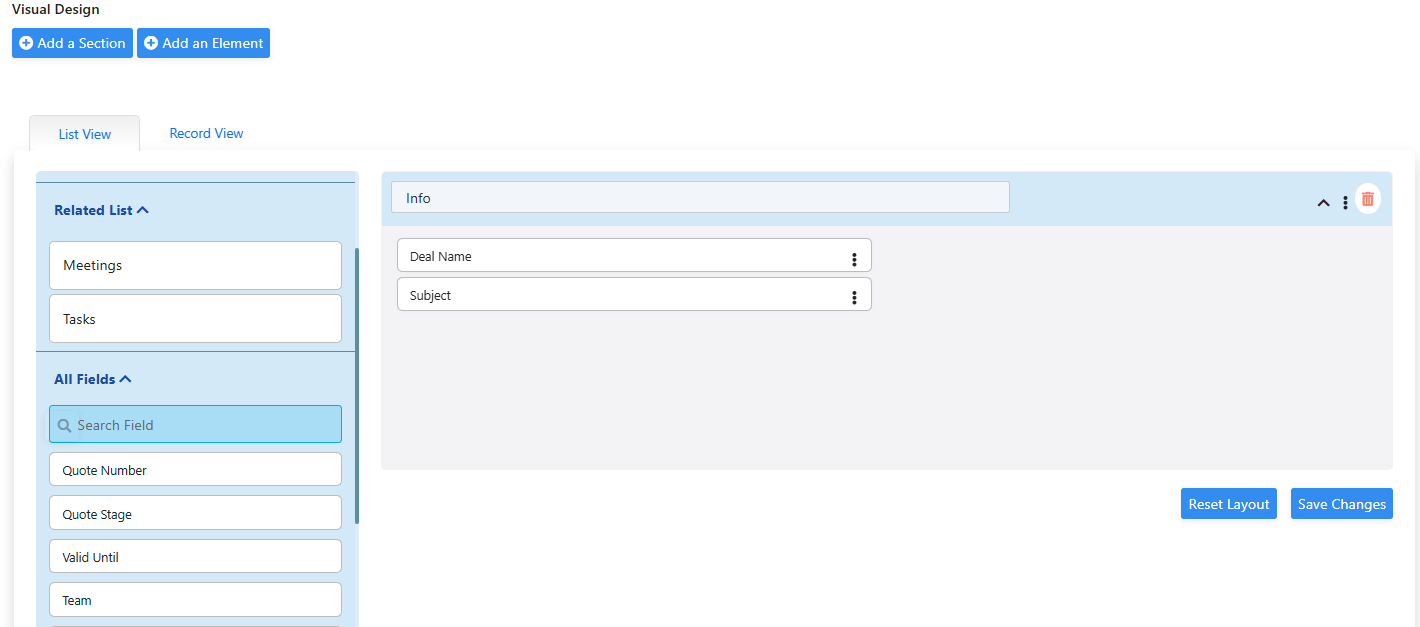 Add in external elements and sections in the list view by using the buttons under "Visual Design."