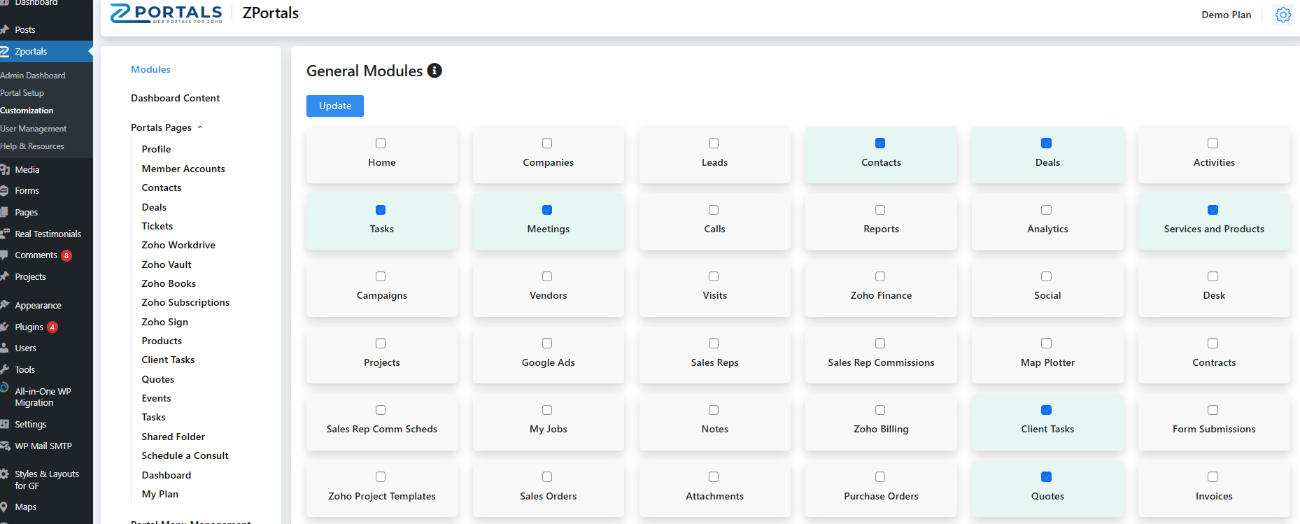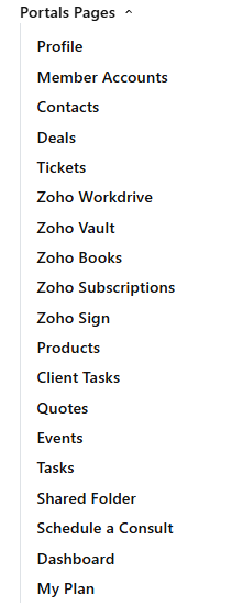 The first section contains the CRM modules that were brought over when Zoho was authorized with ZPortals. Select the modules you want to enable as user menus and then scroll down and hit "Update." This will add the menus you can configure along with the other Zoho apps you enabled in "Portal Setup":