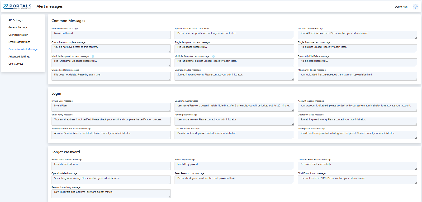 Users will see warnings or messages throughout the portal as a result of various actions. Define those messages based on menus and permissions you have granted your users throughout the portal.