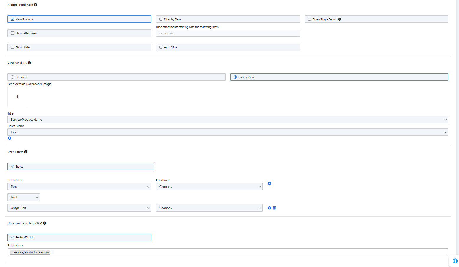 High level features are the ability to use the CRM module fields as filterable on the frontend, the gallery view for a thumbnail list of records and the ability to add external elements (including a custom button in the layout).
