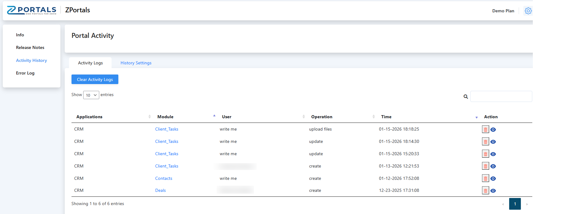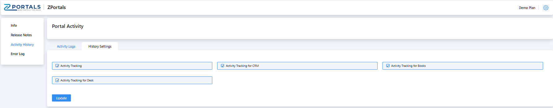 Note this might be relevant because in the system admin that connected ZPortals and Zoho CRM will always show as having made updates, additions, deletions in the portal due to the API integration. To enable history tracking, click into the History Settings sub tab and select "Activity Tracking" and then the app you would like to track: