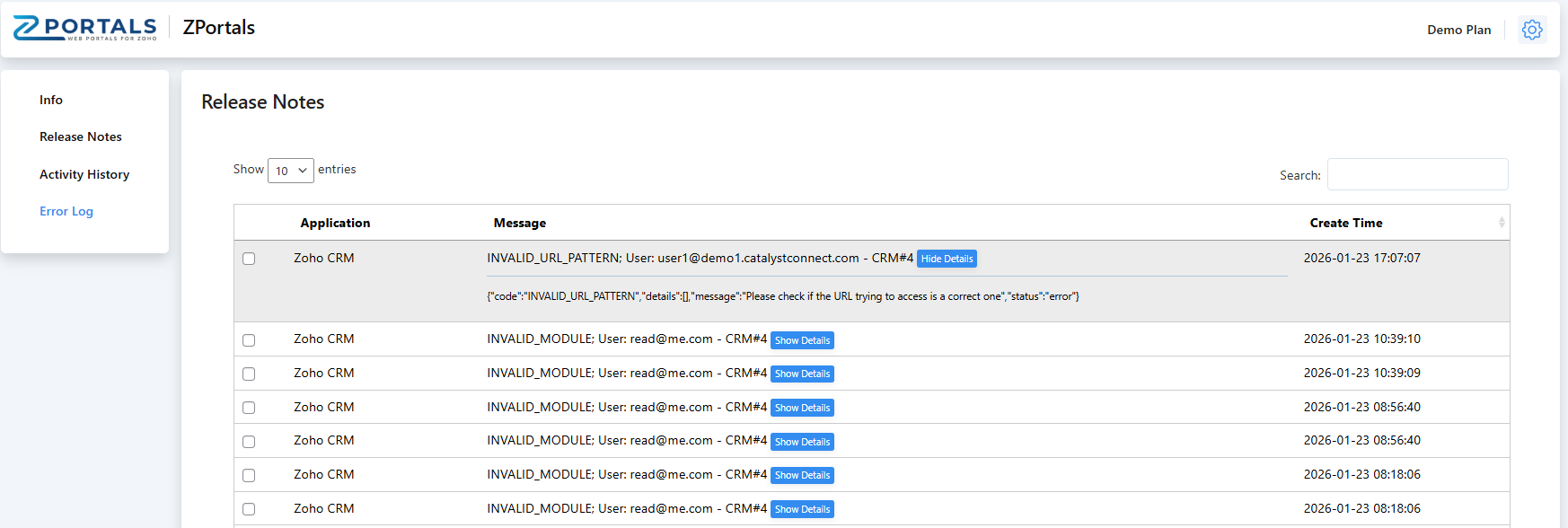The Error Log can be useful when users run into issues, specifically API related errors from Zoho or when a user attempts to sign in but cannot due to an incorrect password. It can also be helpful when a Zoho app is disconnected from the plugin and the authentication failure message appears: