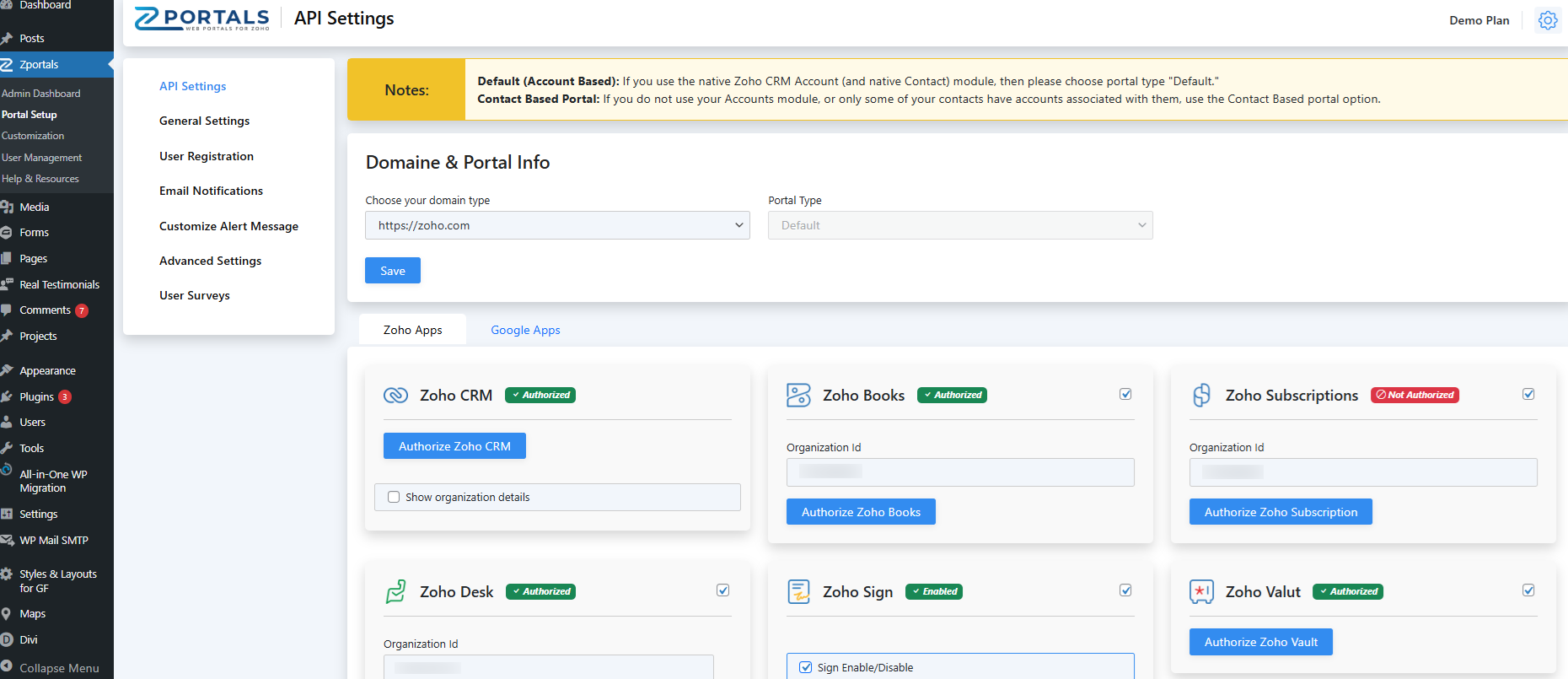Once you have made the domain and portal type selections and saved them, you can begin connecting Zoho Apps to your WordPress website. Note that the only required app is Zoho CRM.